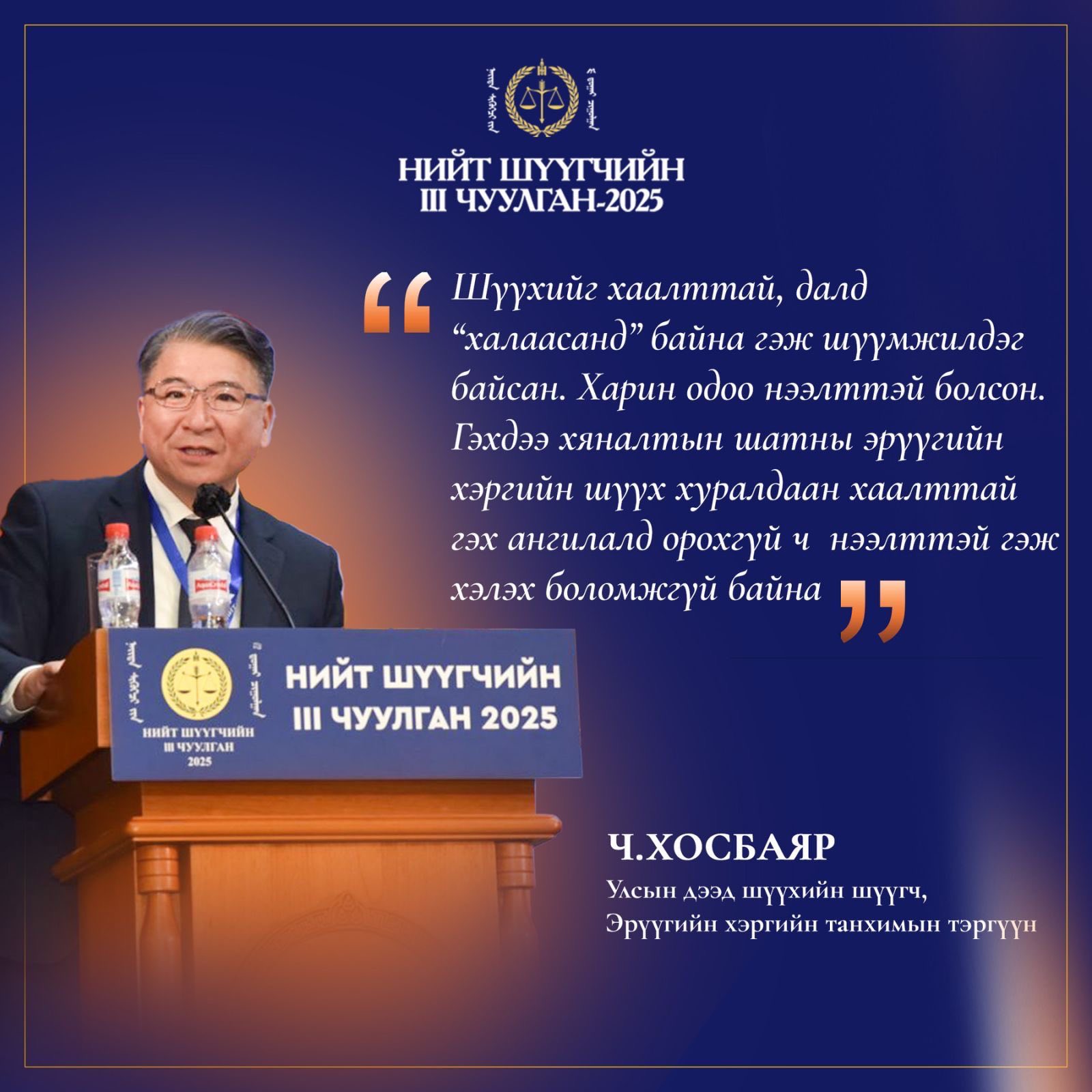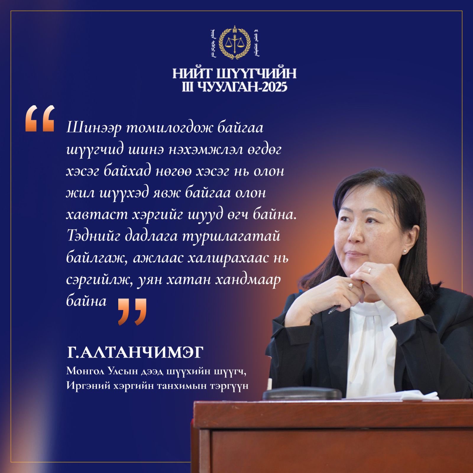 Нийт шүүгчийн III чуулганд Улсын дээд шүүх болон Шүүхийн академиас илтгэгч, панелистаар оролцогчдын илтгэл, хэлэлцүүлгээс онцлох эшлэлийг хүргэж байна